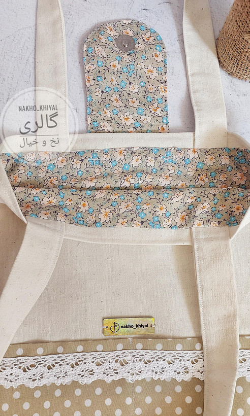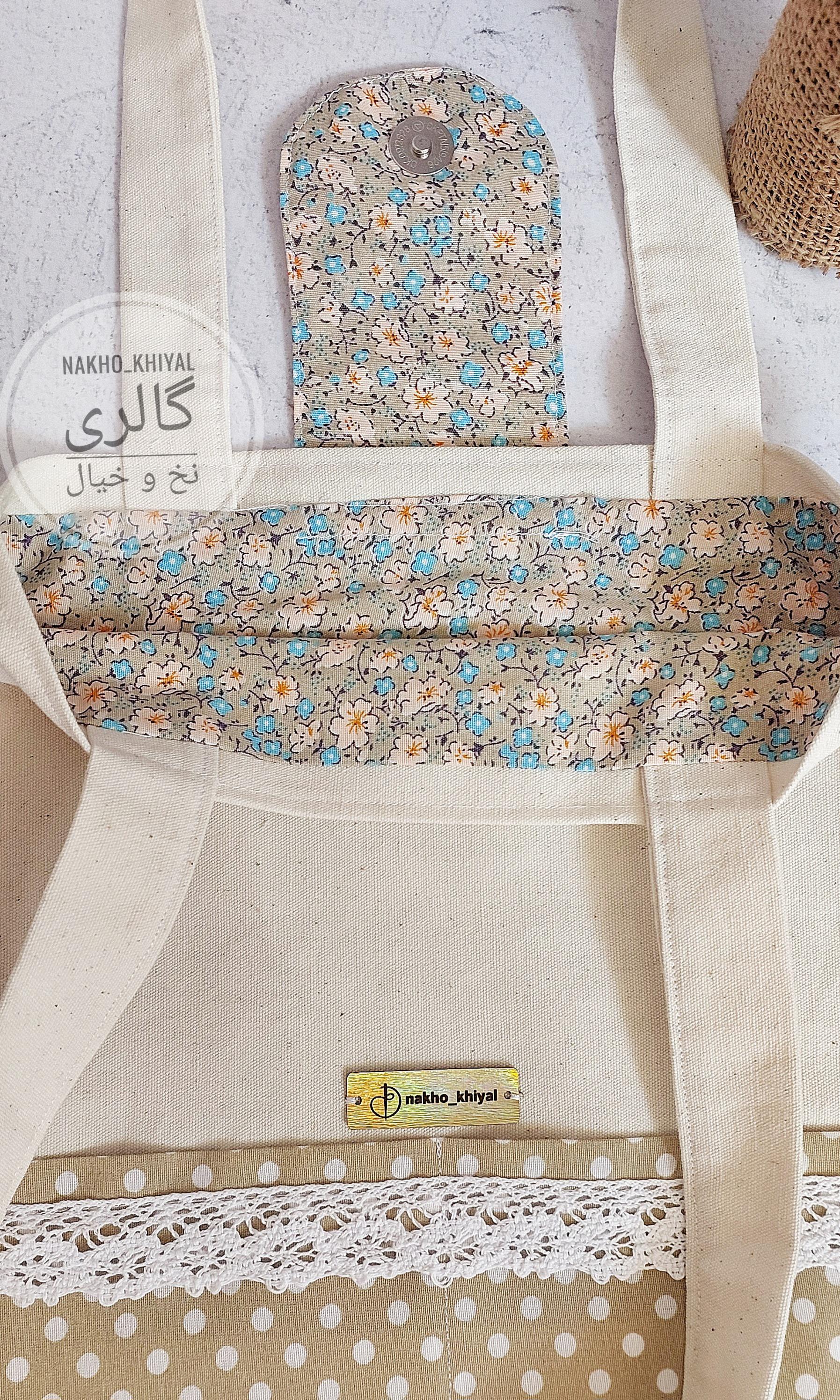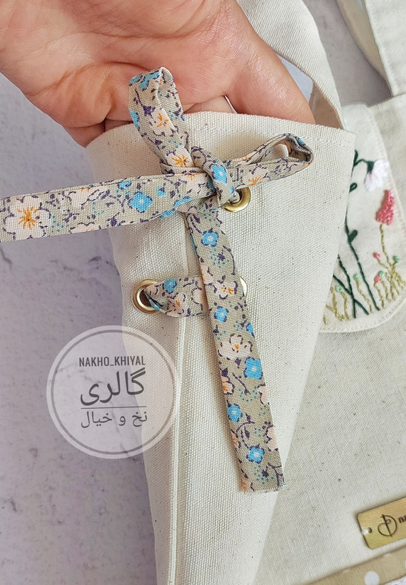 توت بگ گلدوزی پینترستی، دوخته شده با پارچه متقال تمام پنبه ضخیم، آستر دوزی شده و دو تا جیب داره، یکی داخل و یکی روی کار. بسیار خاص و زیبا