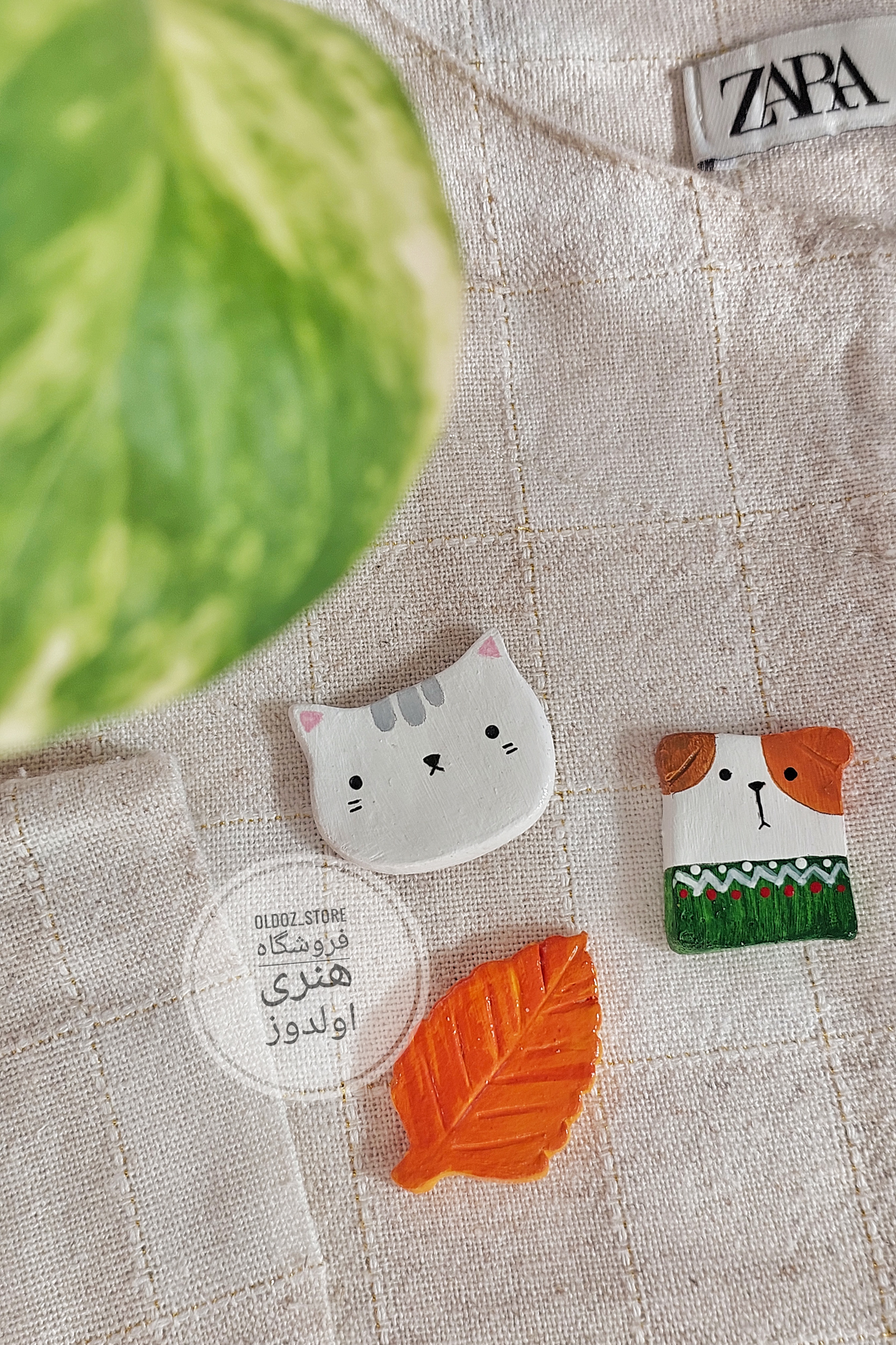 پین، پیکسل یا سنجاق سینه فانتزی در سه طرح گربه، سگ و برگ